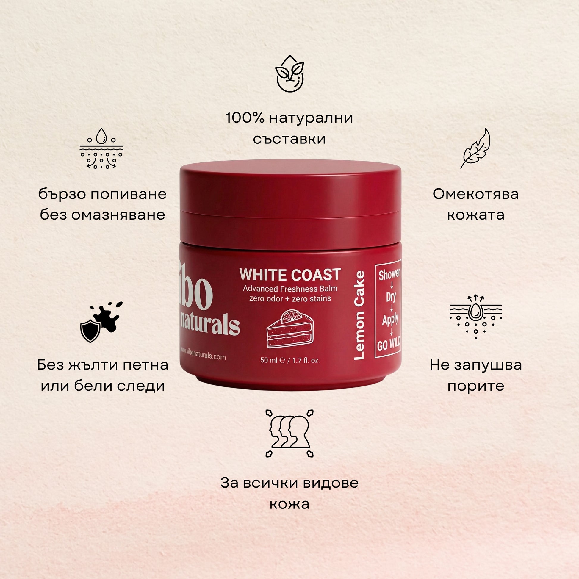 Дългият отговор: White Coast не е антиперспирант (който запушва порите с алуминий), а дезодорант-балсам. Ти ще продължиш да се потиш естествено, защото така тялото ти се охлажда и изхвърля токсини. Но магията е тук: няма да миришеш. Нашата формула неутрализира бактериите, които причиняват лошата миризма. Ще се чувстваш сух/а и свеж/а, без да блокираш тялото си.